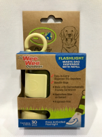 The dispenser comes with two rolls of environmentally friendly wee-wee eco waste bags, which are made with cornstarch and packaged using 100 % recycled cardboard boxes. This bags contain an odor-eliminating technology that absorbs and neutralizes odor on contact by permantly binding with waste. These unscented bags are perfect for thos with fragance sensitivity. This dispenser comes with an attached night time flashlight that makes the night walks a lot easier.